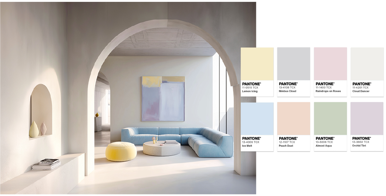 Cloud Dancer emerges as a response to the fast pace of life, taking on a more conscious and strategic role in design. Its presence encourages a more thoughtful approach to how we create and communicate, making room for simplicity and visual breathing space. It is a discreet colour that supports and acts as a foundation for more sensitive and balanced languages.