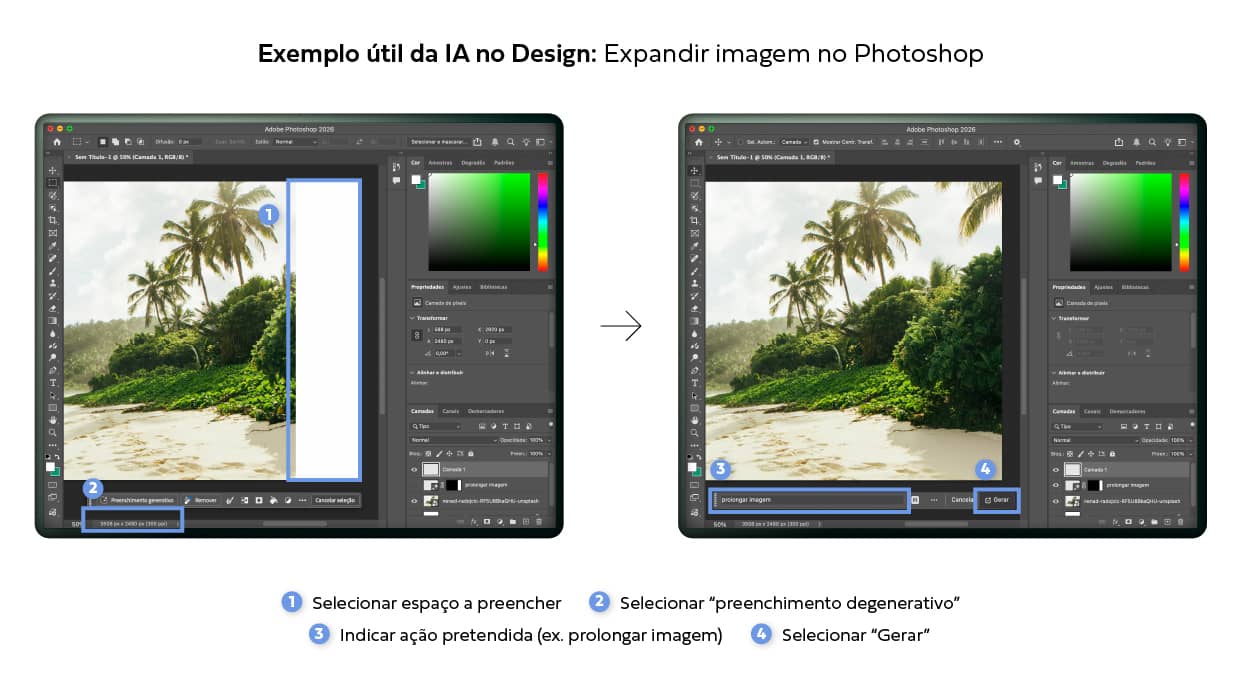 A IA desempenha um papel relevante na automatização de tarefas repetitivas, ajudando a agilizar processos que antes exigiam muito mais tempo. Ferramentas como o Figma AI, o Adobe Firefly e outras, permitem ações específicas como expandir imagens, organizar elementos com mais rapidez e agilizar tarefas, libertanto tempo para aprofundarmos ideias e explorararmos soluções com criatividade.